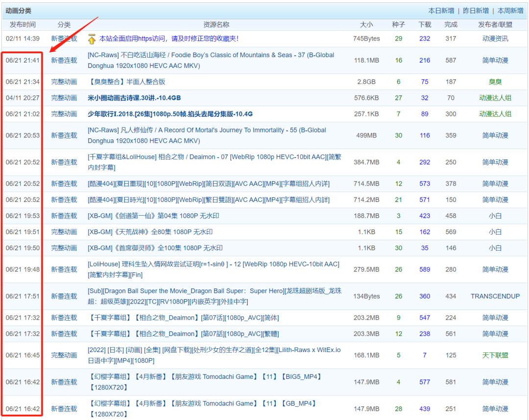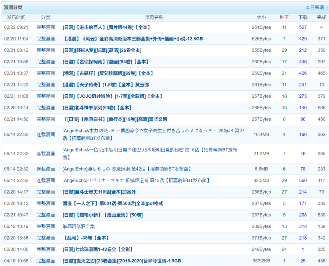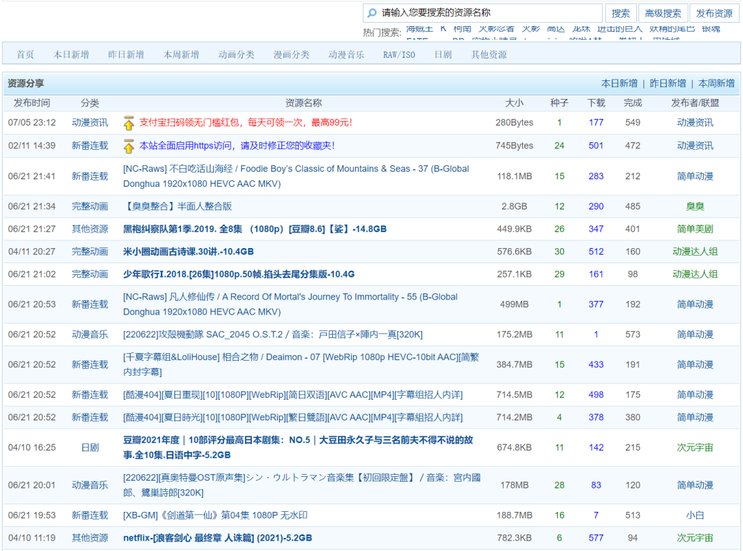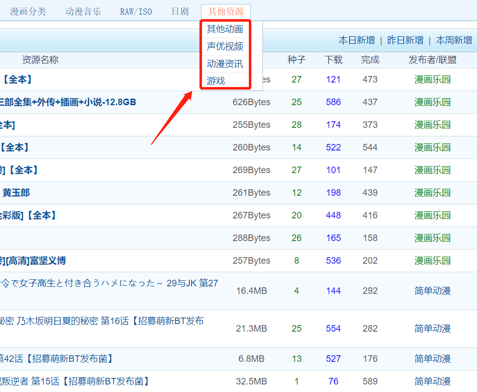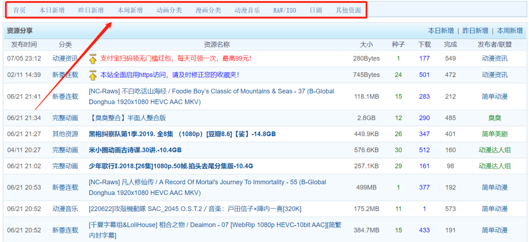 相信大家早就已经驾轻就熟,除了正常的自上而下浏览之外,论坛的主要功能则集中在它顶部的导航分类上,包括了:本日新增、昨日新增、本周新增、动画分类、漫画分类、动漫音乐、RAW/ISO、日剧、以及其他资源等: