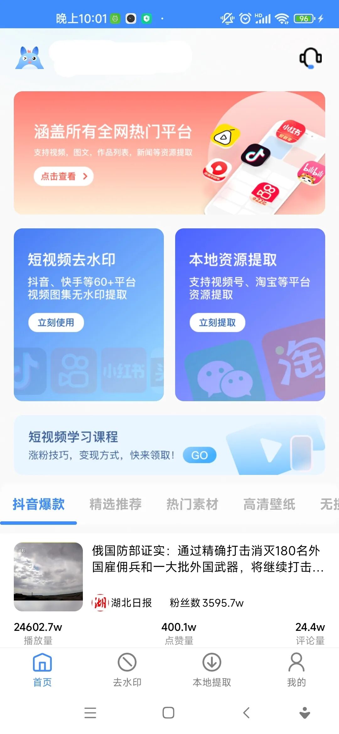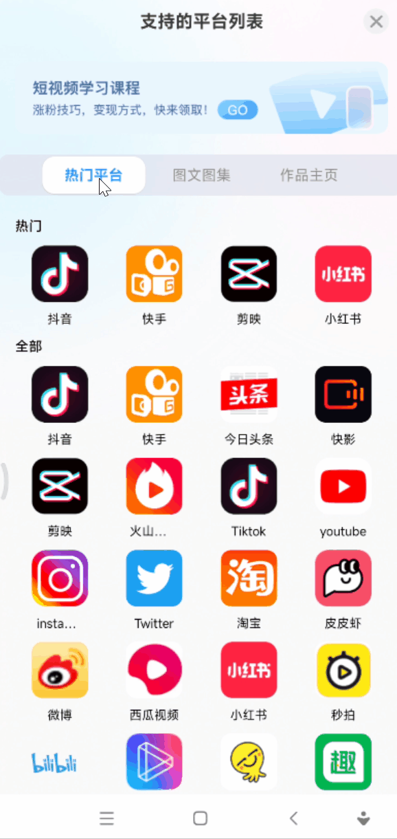 软件打开,UI设计可圈可点,功能也正如主页上标明的:覆盖所有全网热门平台,支持视频、图文、作品、列表、新闻等资源的提取: