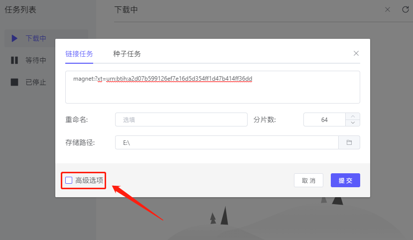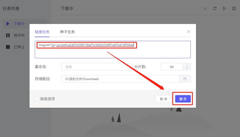 那么,我们首先来看看磁力下载的效果,老规矩,直接用刺客之前推荐的任意软件或者网站,复制想要下载的磁力链,然后直接怼到输入框里,并点击“提交”: