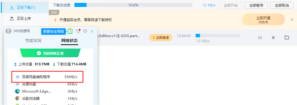 然后就厉害了,虽然百度网盘里显示的依旧是小水管,但注意已下载的文件大小,那真是肉眼可见的每秒几十Mb在跑,非常的犀利!