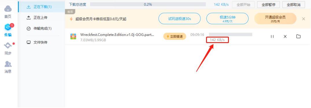这时候,我们打开百度网盘,随便下载一个你想要下载的资源,当然,肯定很慢很慢,但是不用管: