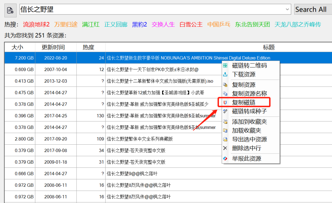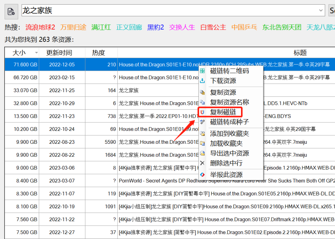 找到想要的资源后,按鼠标右键,在弹出的菜单中,选择复制磁链。