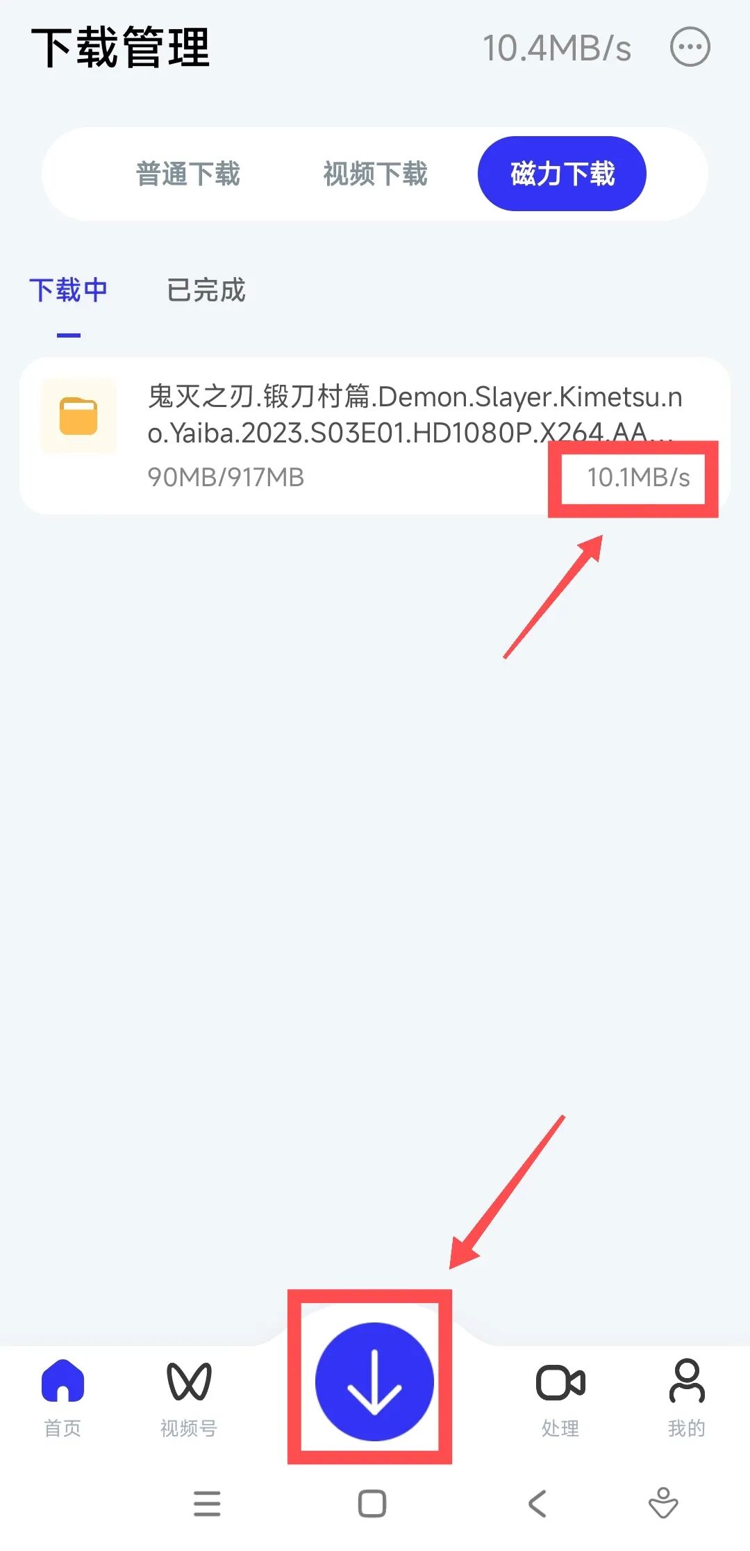 这个时候要特别注意,操作完以上步骤后,我们需要点击底部的下载图标,也就是进入下载管理,在这里,我们可以看到刚刚添加的任务;至于速度,这里也都是有目共睹!百兆光纤直接冲到每秒10MB,可以说是满速下载了!