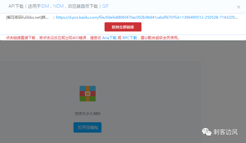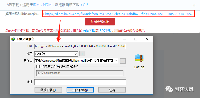插件提供了多种下载方式,大家可以结合自身情况选择,刺客因为本机已经安装过IDM(1月份也已经分享过),所以使用的是API下载。