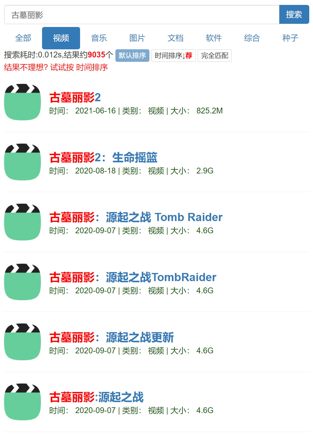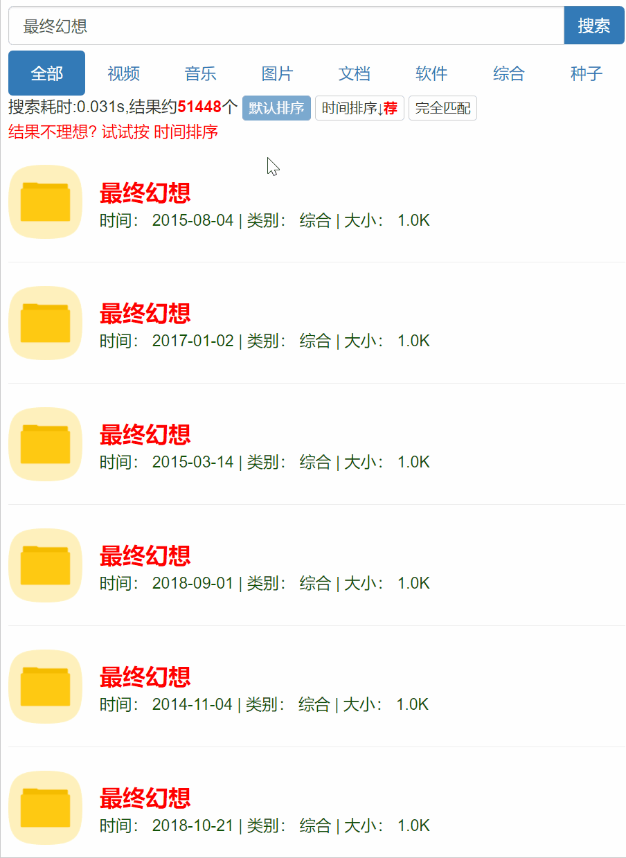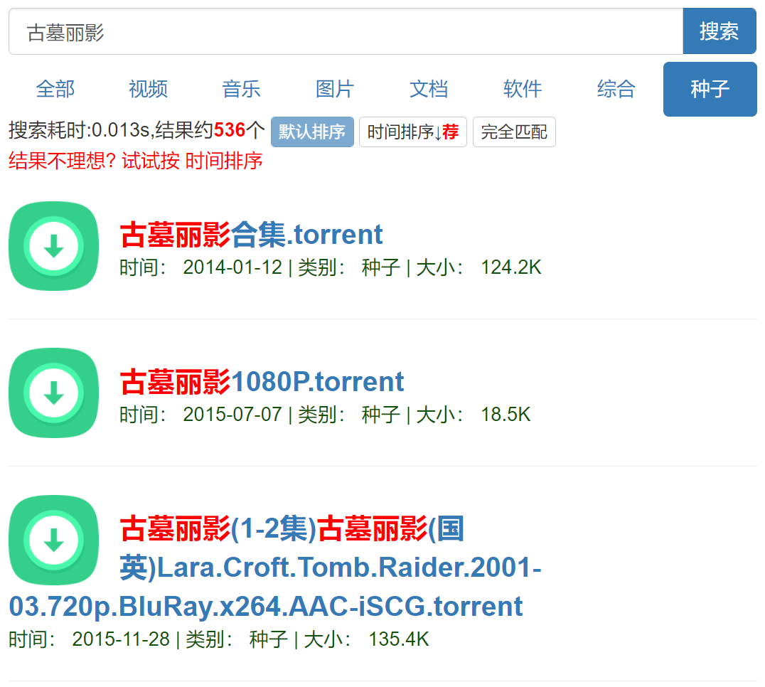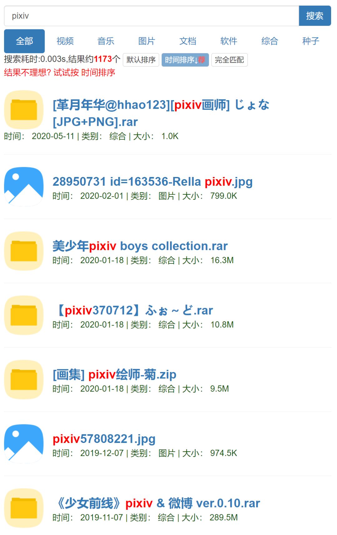 并且,搜索结果也可以进行筛分,包括:视频、音乐、图片、文档、软件、综合、种子.....也都是有图有真相: