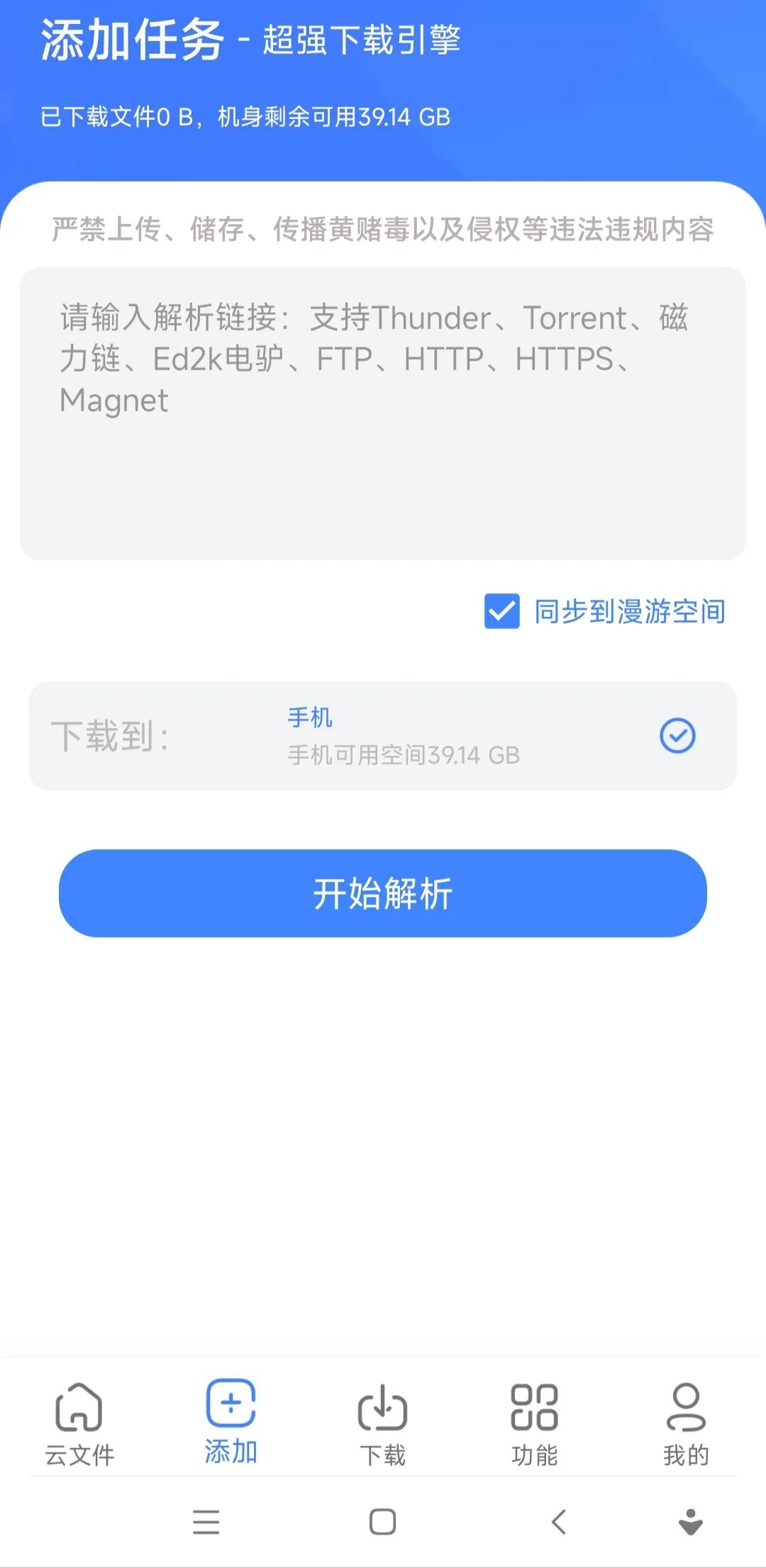 点击底部菜单的添加,我们来看看,它支持哪些资源?包括有:迅雷链、BT种子、磁力、电驴、FTP、HTTP、HTTPS....,算是相当全面了。
