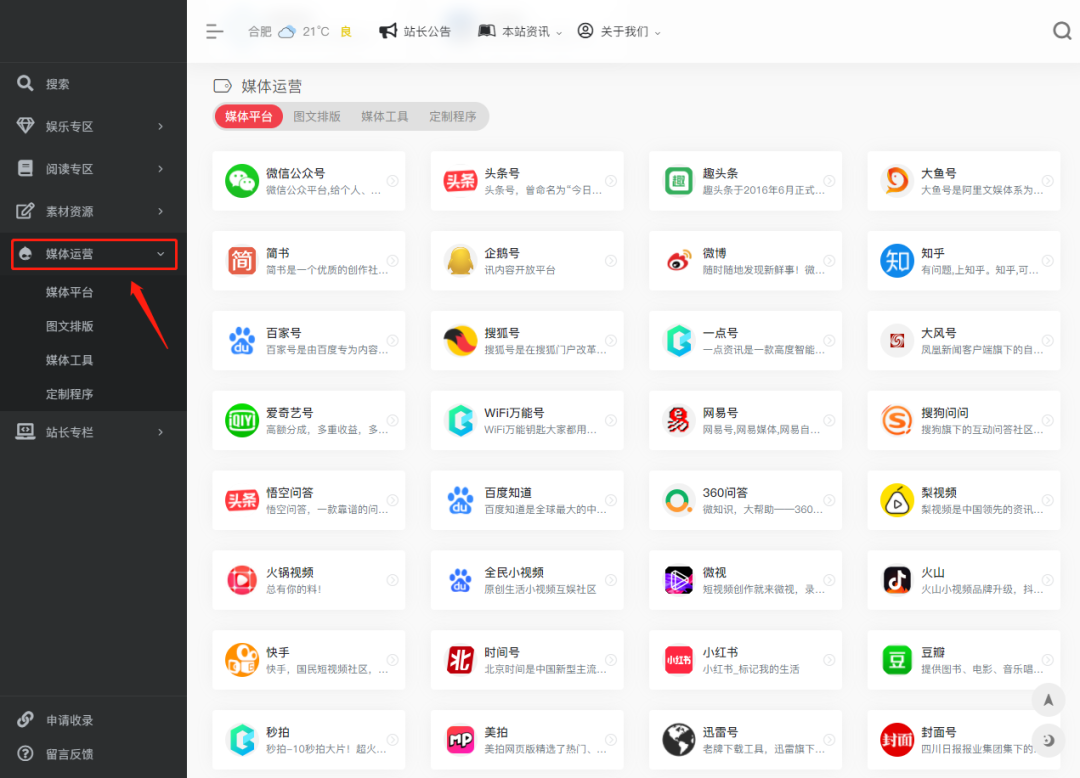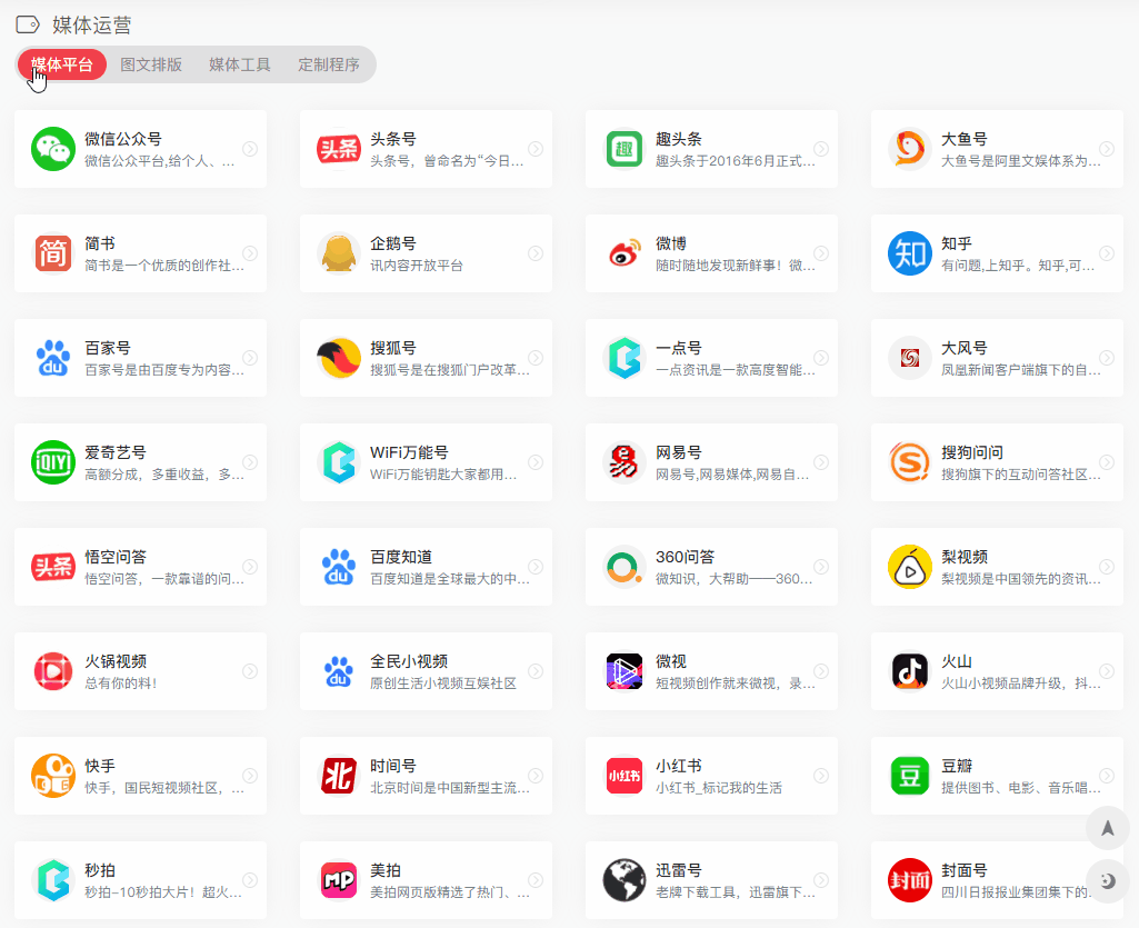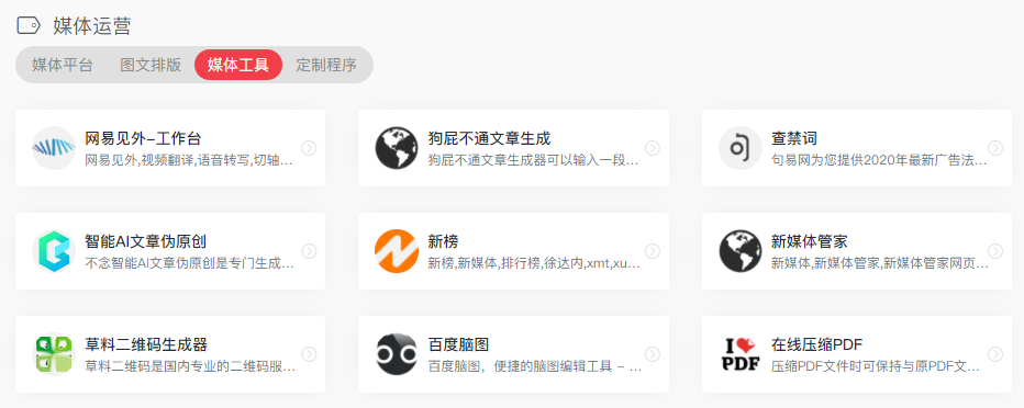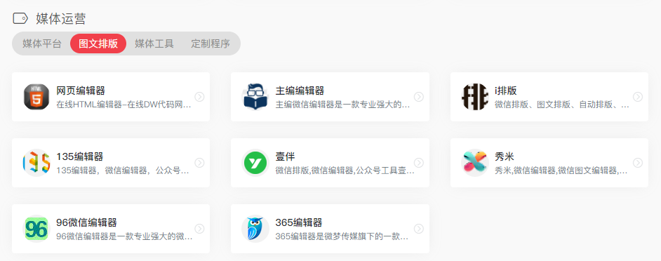 里面包括:媒体平台、图文排版、媒体工具,以及定制程序。