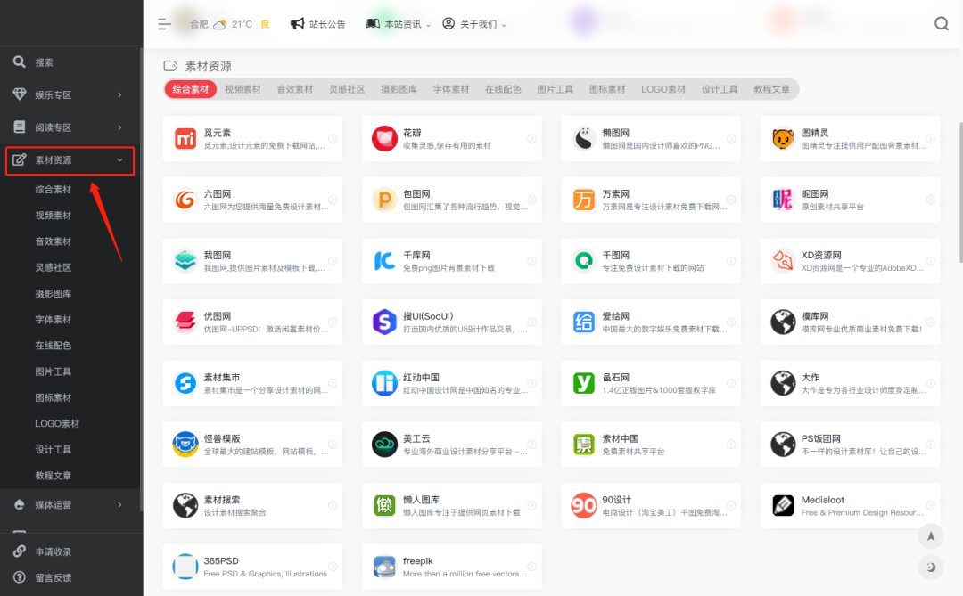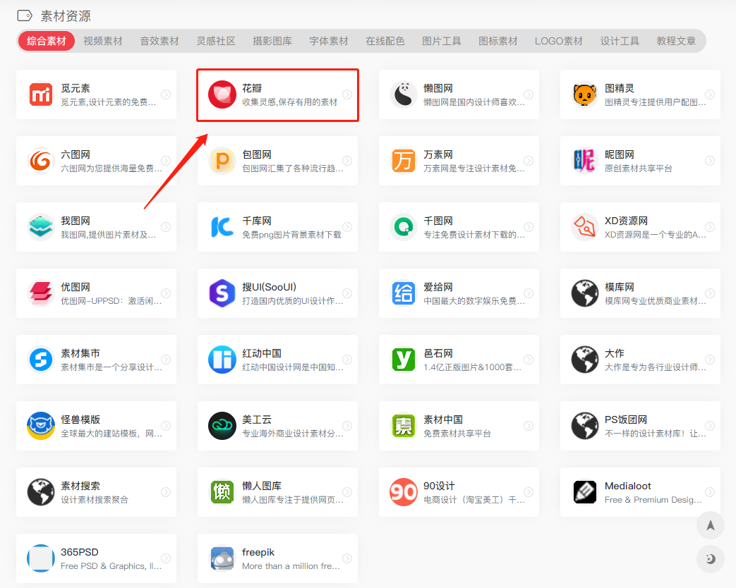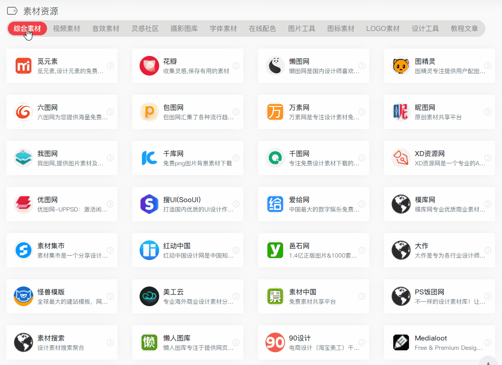 这里面包含的内容就更多了,主要有:综合素材、视频素材、音效素材、灵感社区、摄影图库、字体素材、在线配色、图片工具、图标素材、logo素材、设计工具、教程文章等,算是所有内容创造者的福音!