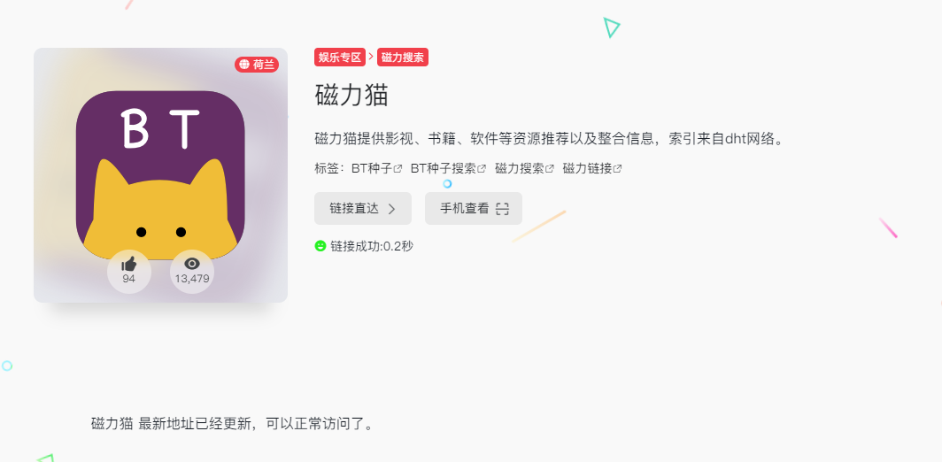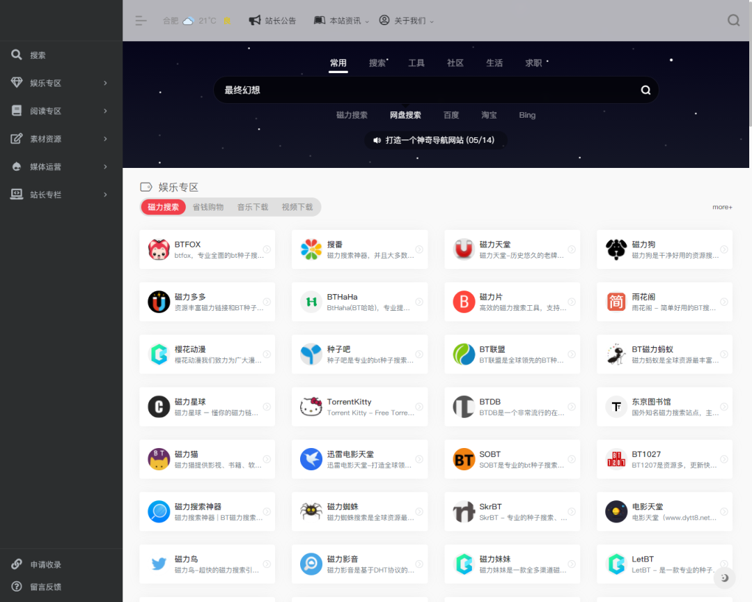 磁力天堂导航,这是一个光听名字,就知道相当牛掰的万能资源导航网站!因为它不仅全面收录了全网所有磁力搜索网站、网盘搜索网站,更支持一个搜索搞定所有资源引擎!妥妥的聚合类神器,这还没完,像漫画、小说、图库、音乐、视频、学习、素材、工具这些,也都统统帮大家安排上了,就一个字:绝。