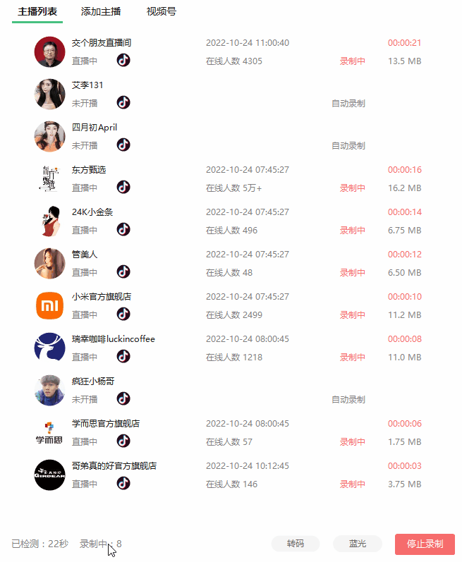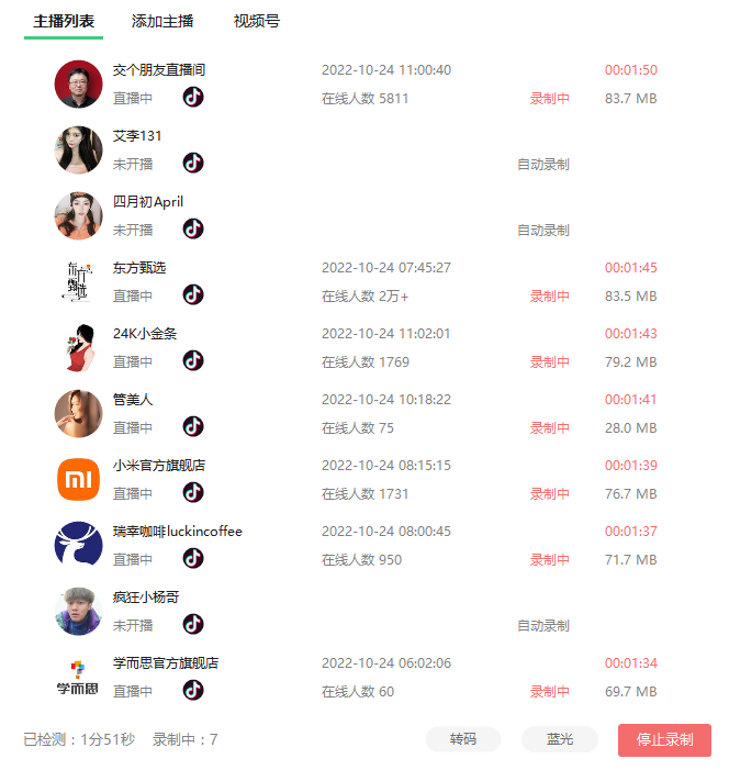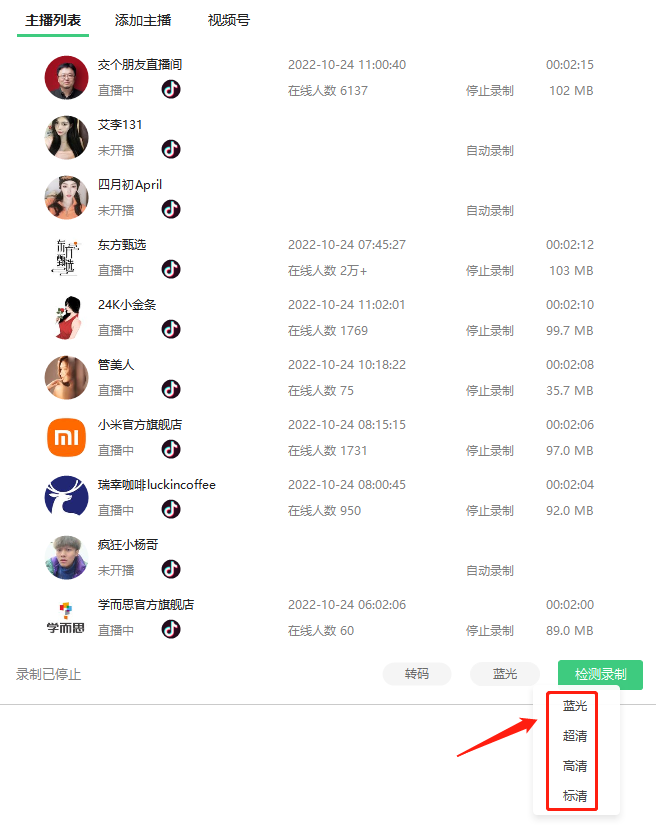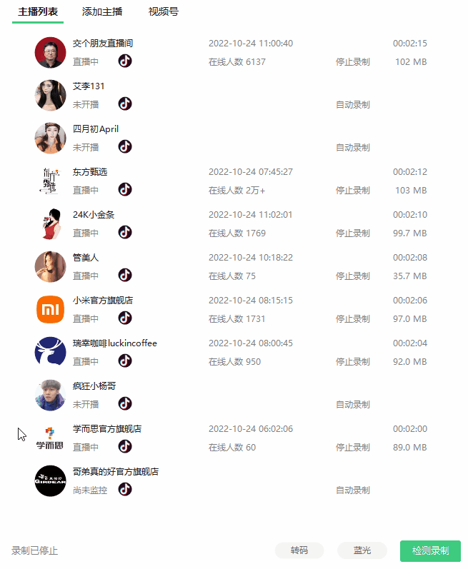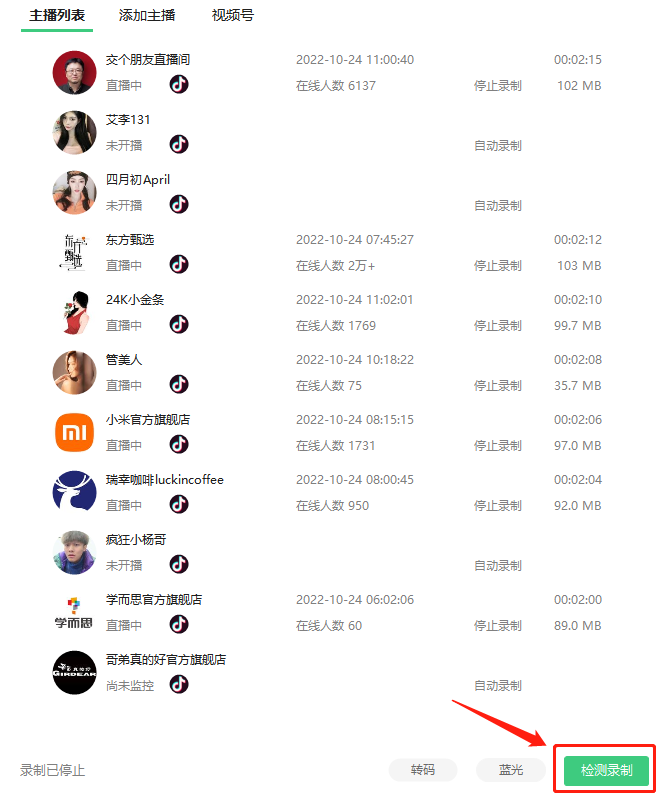 添加好所有想要录制的直播间后,点击右下角的“检测录制”: