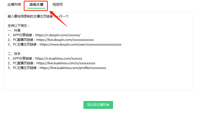 正确打开后,什么也别管、什么也别问,直接点击顶部的“添加主播”: