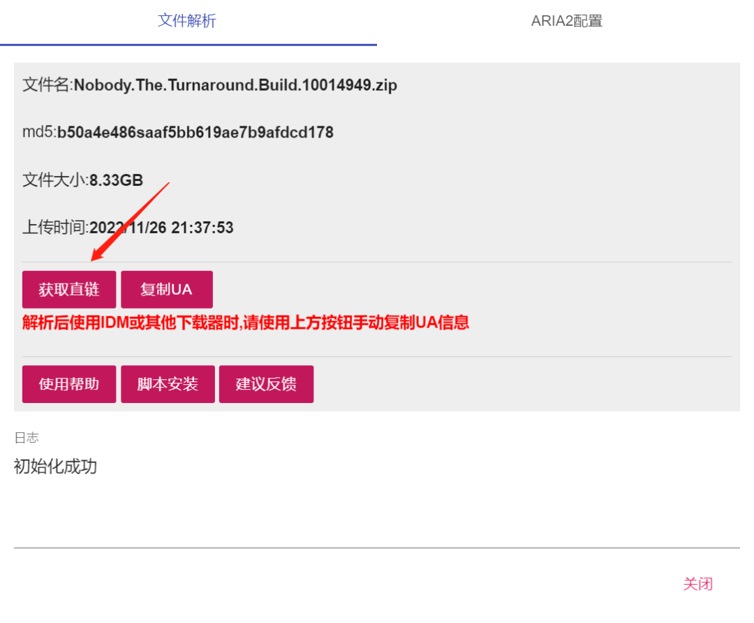 便会自动弹出解析窗口,这里点击“获取直链”: