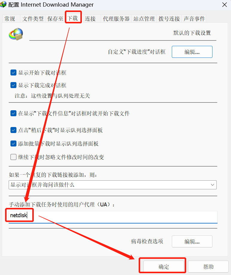 找到手动添加下载任务时使用的UA,把刚刚复制的内容粘贴进去,并点击“确定”。