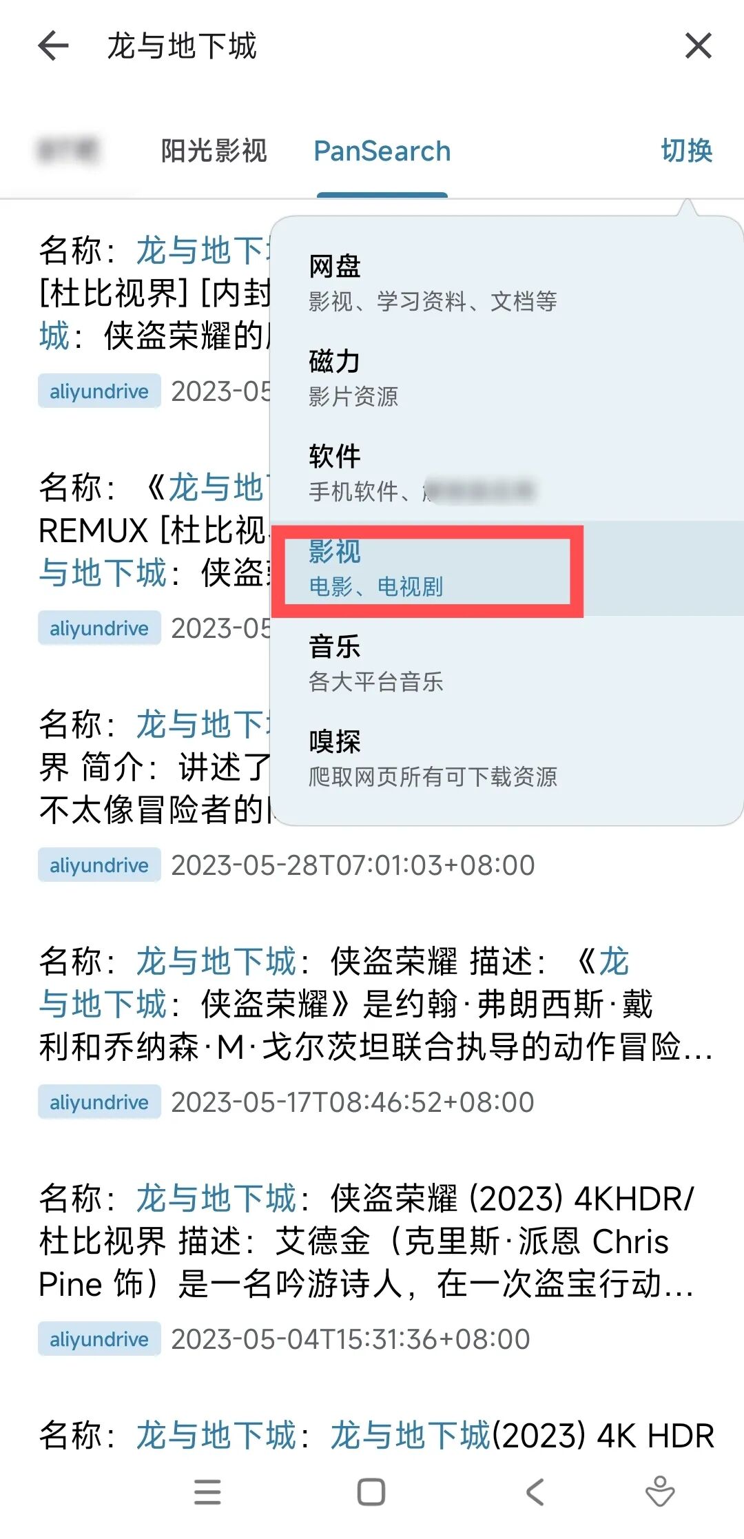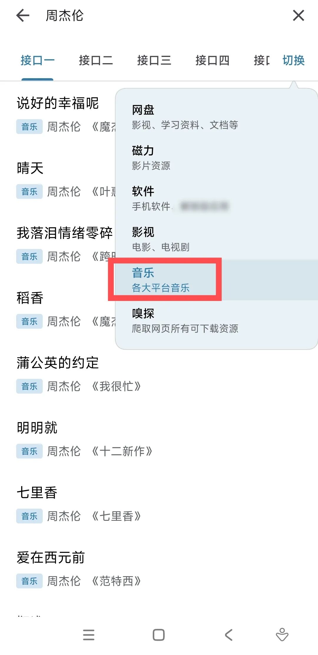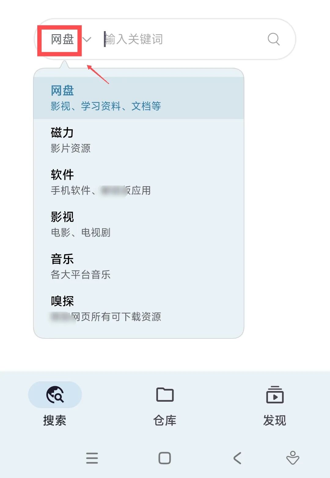 我们点击左边,这个下拉箭头,可以看到里面包括了:网盘、磁力、软件、影视、音乐,以及嗅探。