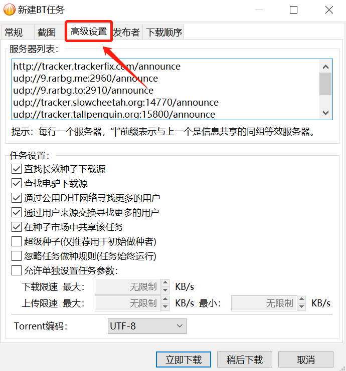 另外,点击顶部的高级设置,这里可以选择相应的服务器,以及各种下载参数。
