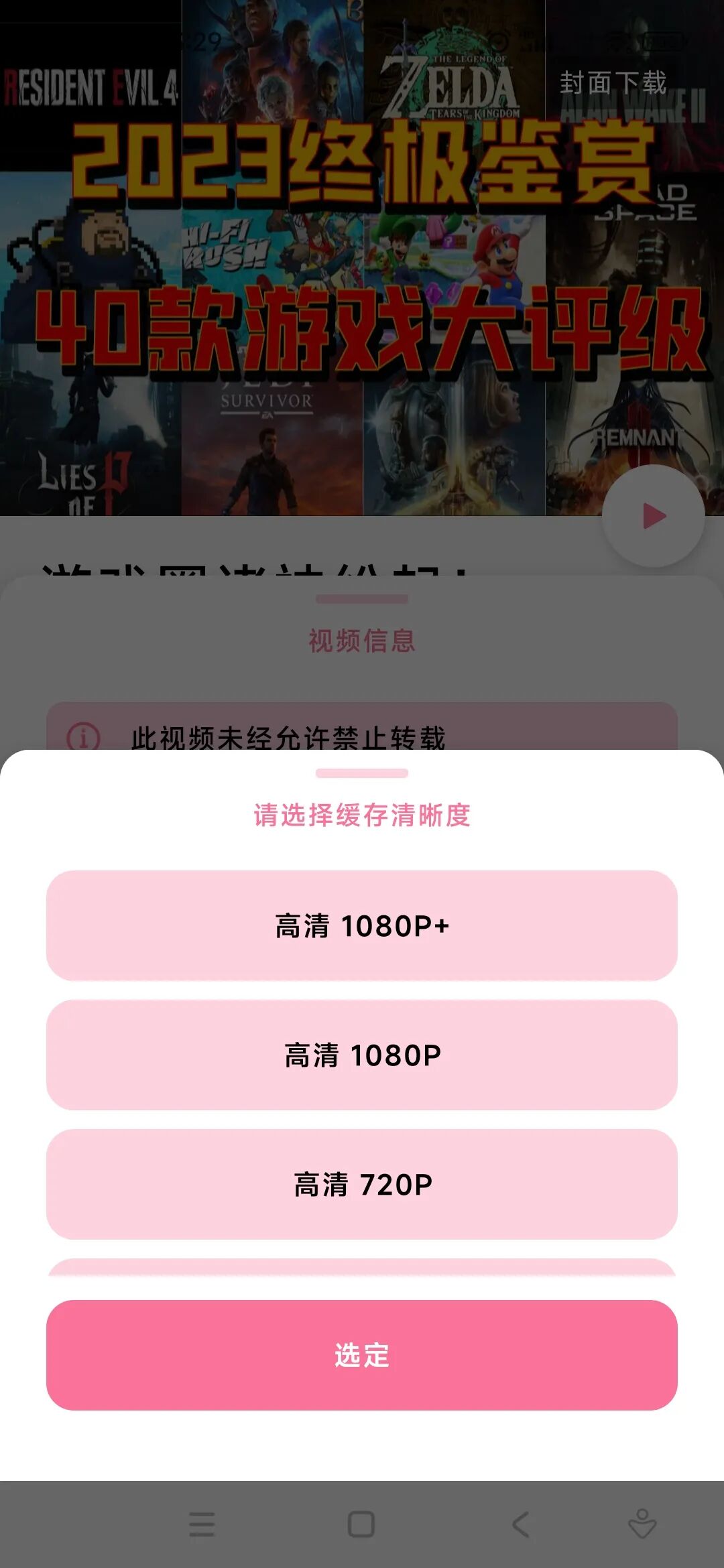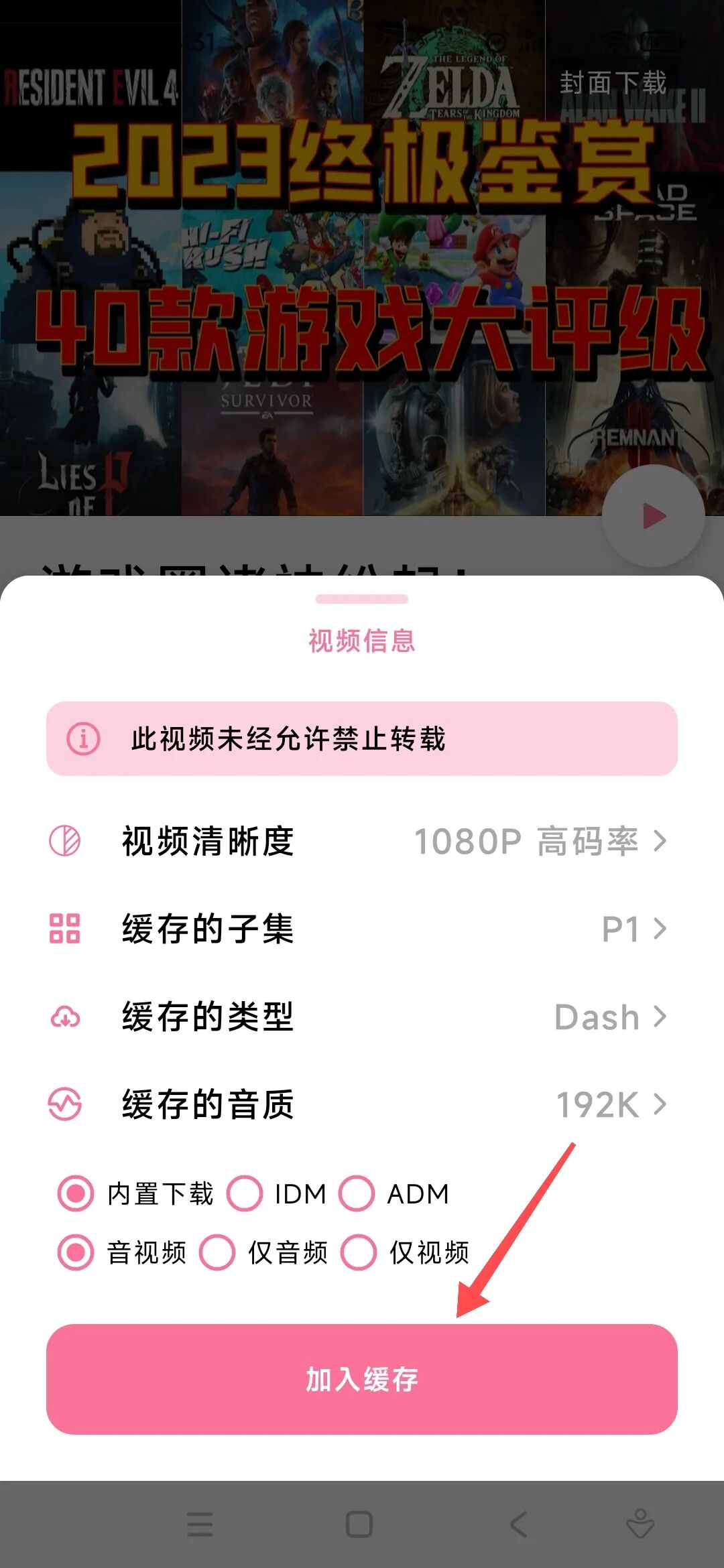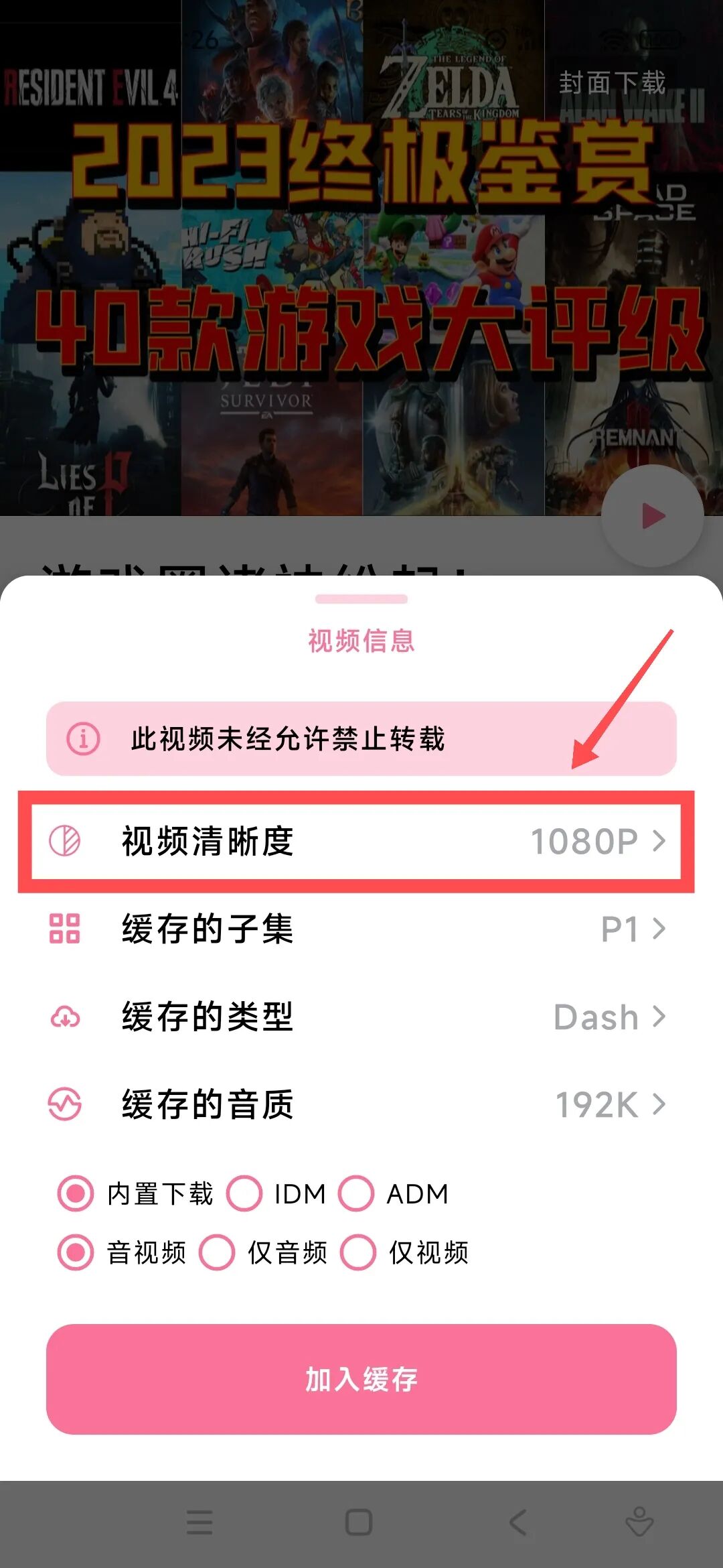 点击缓存视频后,可以设定相应参数,比如说清晰度。