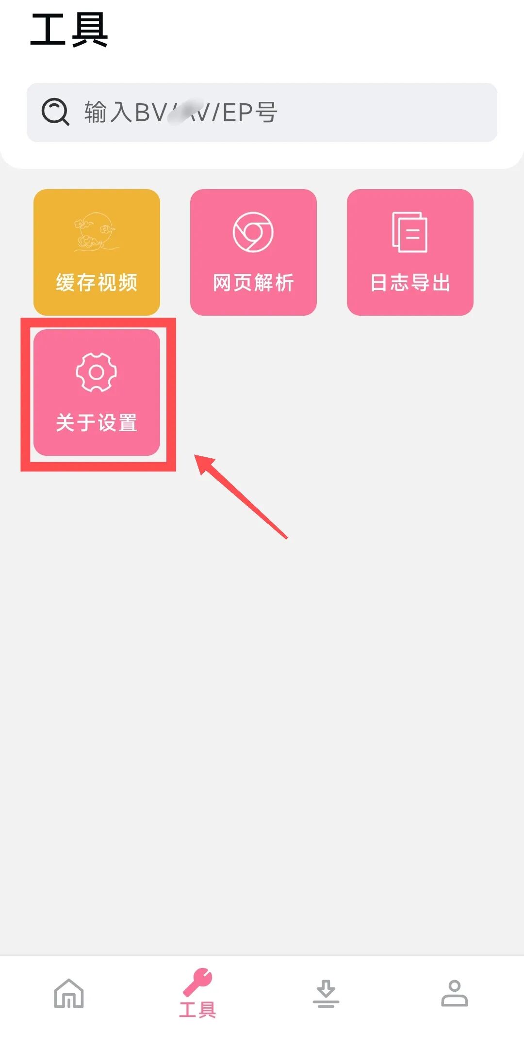 最后,有一个细节,需要重点说明,也就是视频下载的位置;这里我们首先需要进入底部工具里的关于设置。