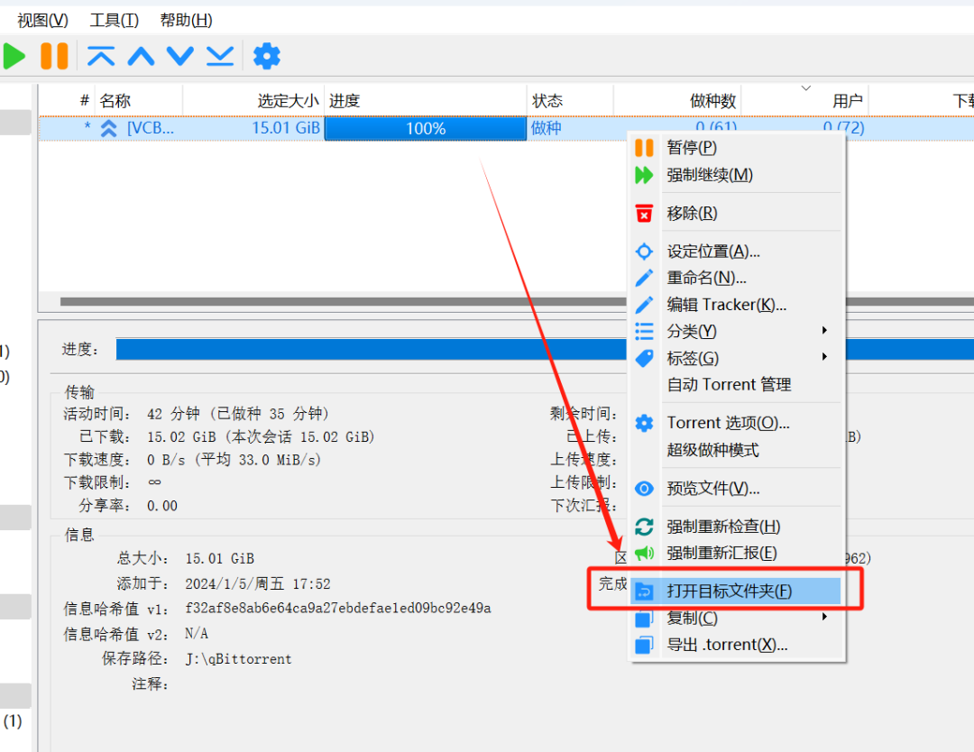 对于下载好的任务,我们按鼠标右键,在弹出的菜单中选择打开目标文件夹。