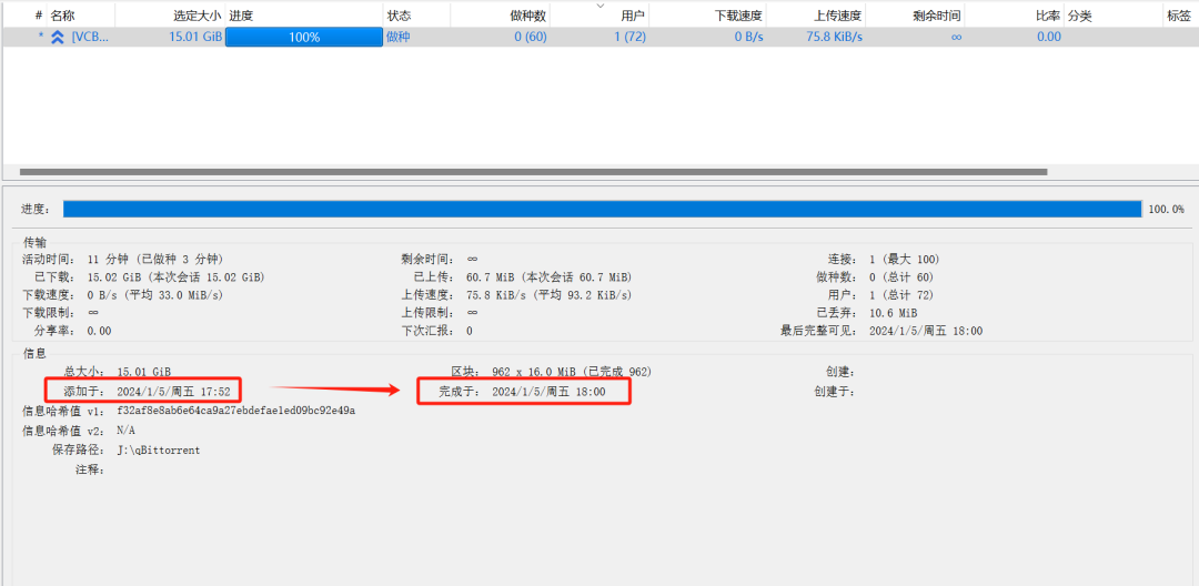 最后可以看到,15GB的容量,仅仅8分钟便下载完成。