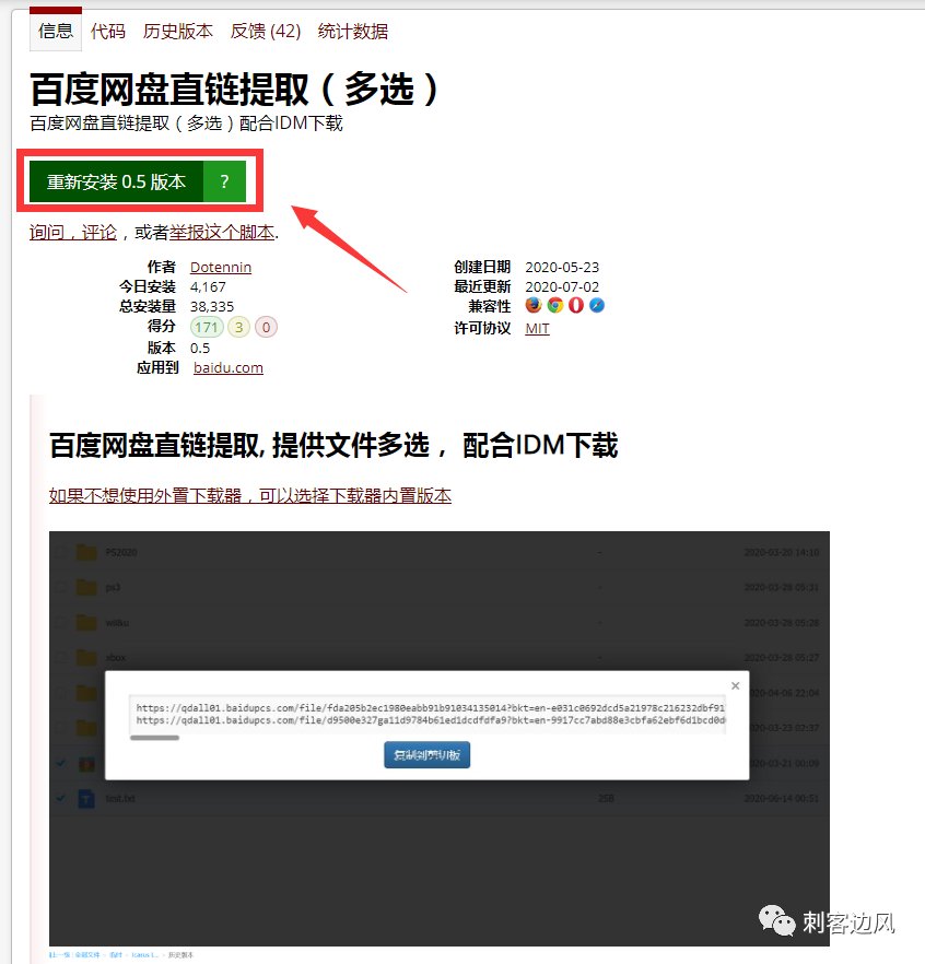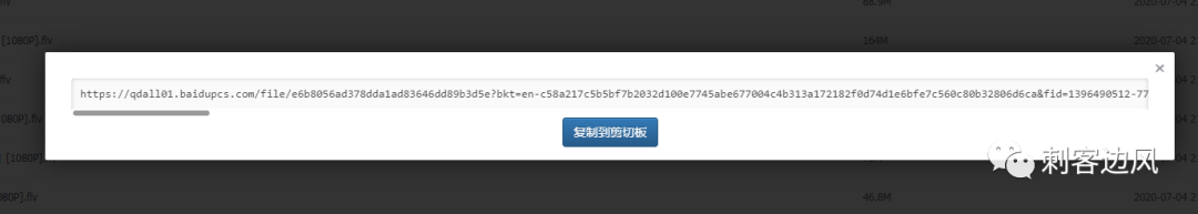 这就是油猴子脚本的作用。点击下载,就会弹出对话框。需要说明一下,这个同样支持多选,多个文件就会对应生成多个链接。点击「复制到剪切板」。