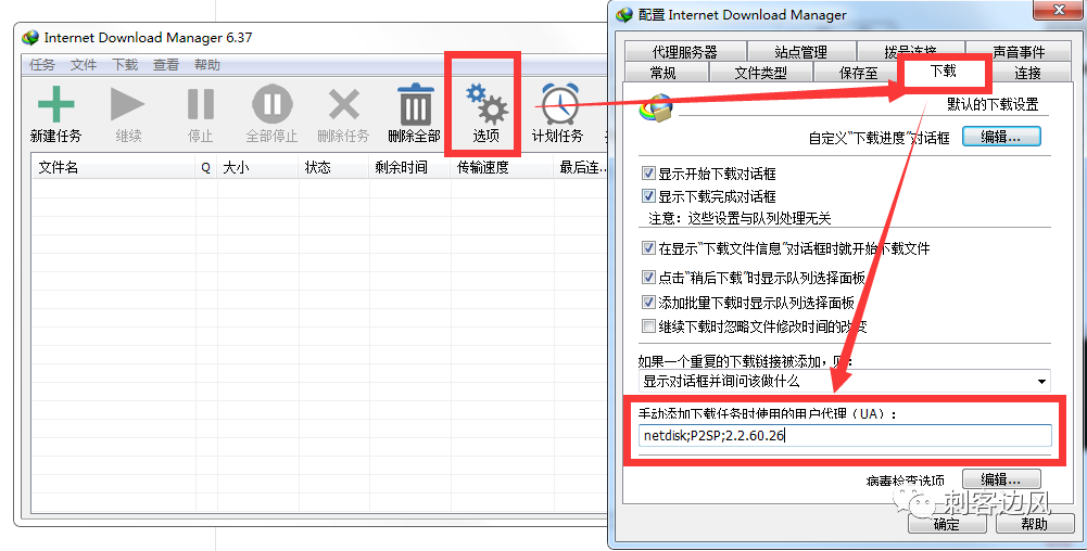 4、设置IDM的参数,我们点击:选项 -下载 - 设置代理为:netdisk;P2SP;2.2.60.26