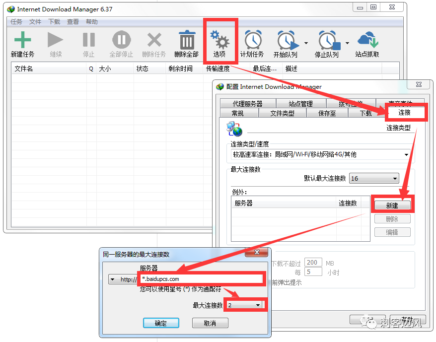 5、再点击小导航右侧的 连接 - 新建 按照如下图所示填入:*.baidupcs.com,最大连接数 2