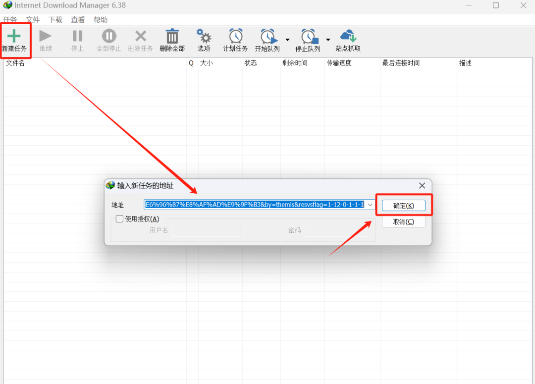 之后就很简单了,在IDM左上角点击新建任务,将刚才复制好的链接粘贴进去,并点击确定。