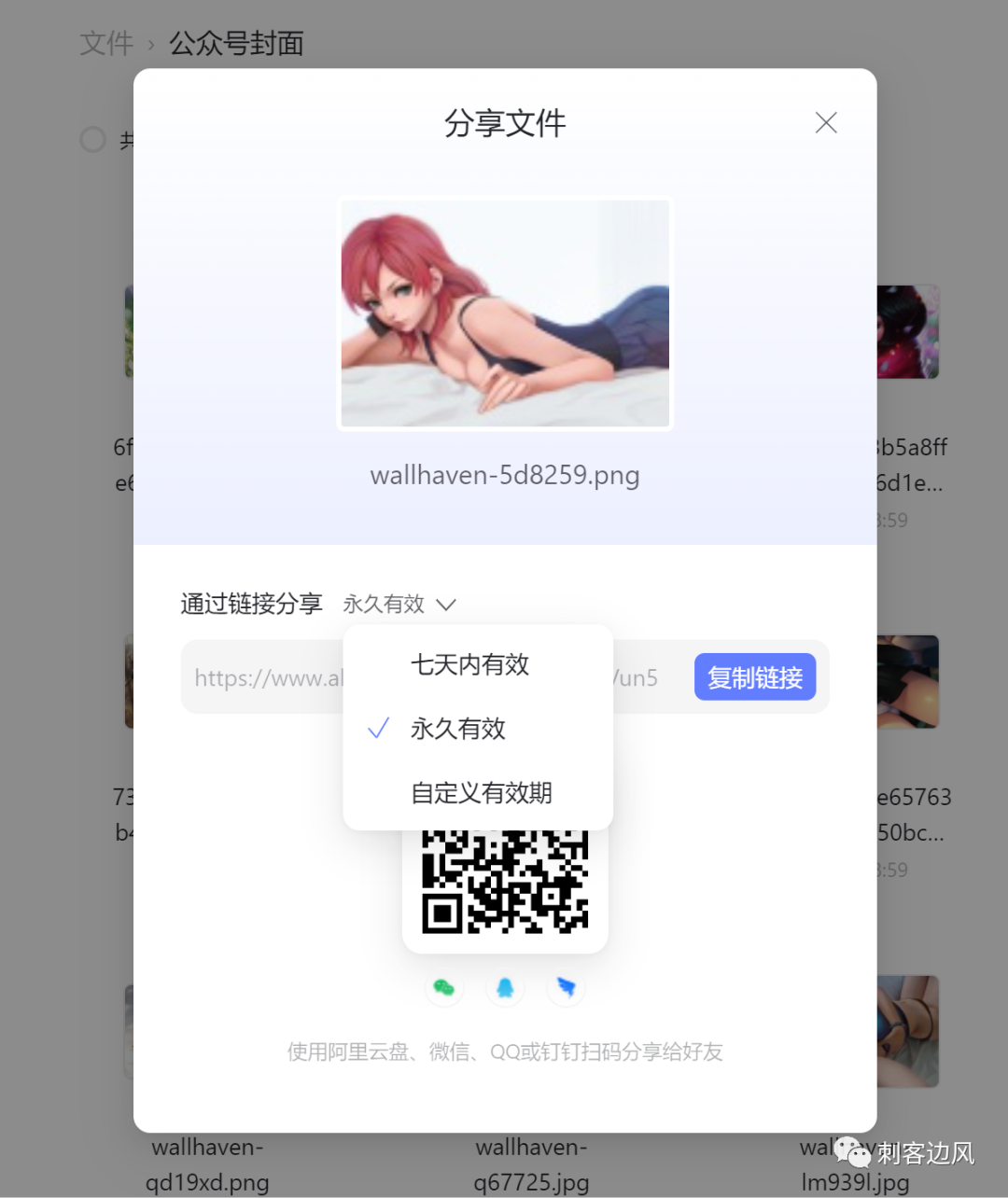 点击后,就会开启分享链接,可以自由选择7天、永久、自定义有效期: