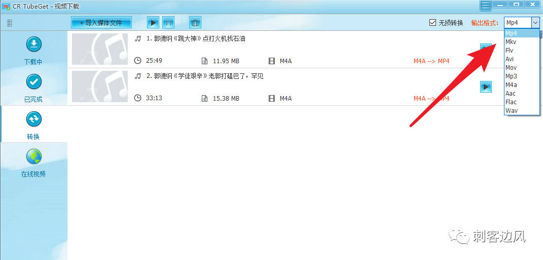除了常规的下载功能外,软件居然还提供了格式转换,这不就是妥妥的格式工厂了吗?支持的格式众多,包含且不限于MP4、FLV、MKV等,可谓十分强悍!