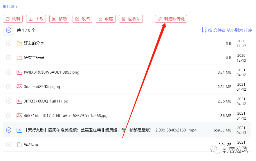 以上都是毛毛雨了,接下来!就是最激动人心的时刻了,那就是支持创建分享链接!怎么操作呢,首先,选中任意一个文件,点击“新建秒传链”按钮: