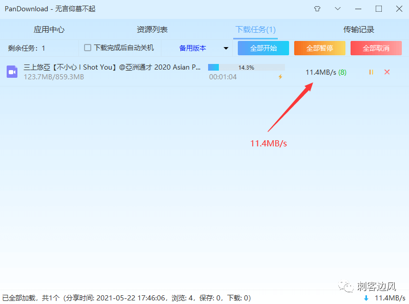 接下来,就是见证奇迹的时刻了,大家看看这下载速度,直接飚到11.4MB/s,一部电影居然一分钟就能搞定,强悍。