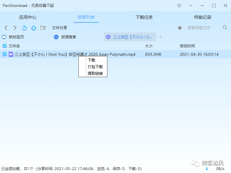 软件无需安装,直接双击.exe程序即可运行,这里注意千万不要登录账号(登录有封号风险,小号请无视),我们只要将想下载的文件分享出来,再将分享链接复制粘贴进来,软件会自动嗅探解析,这时鼠标右键下载即可:
