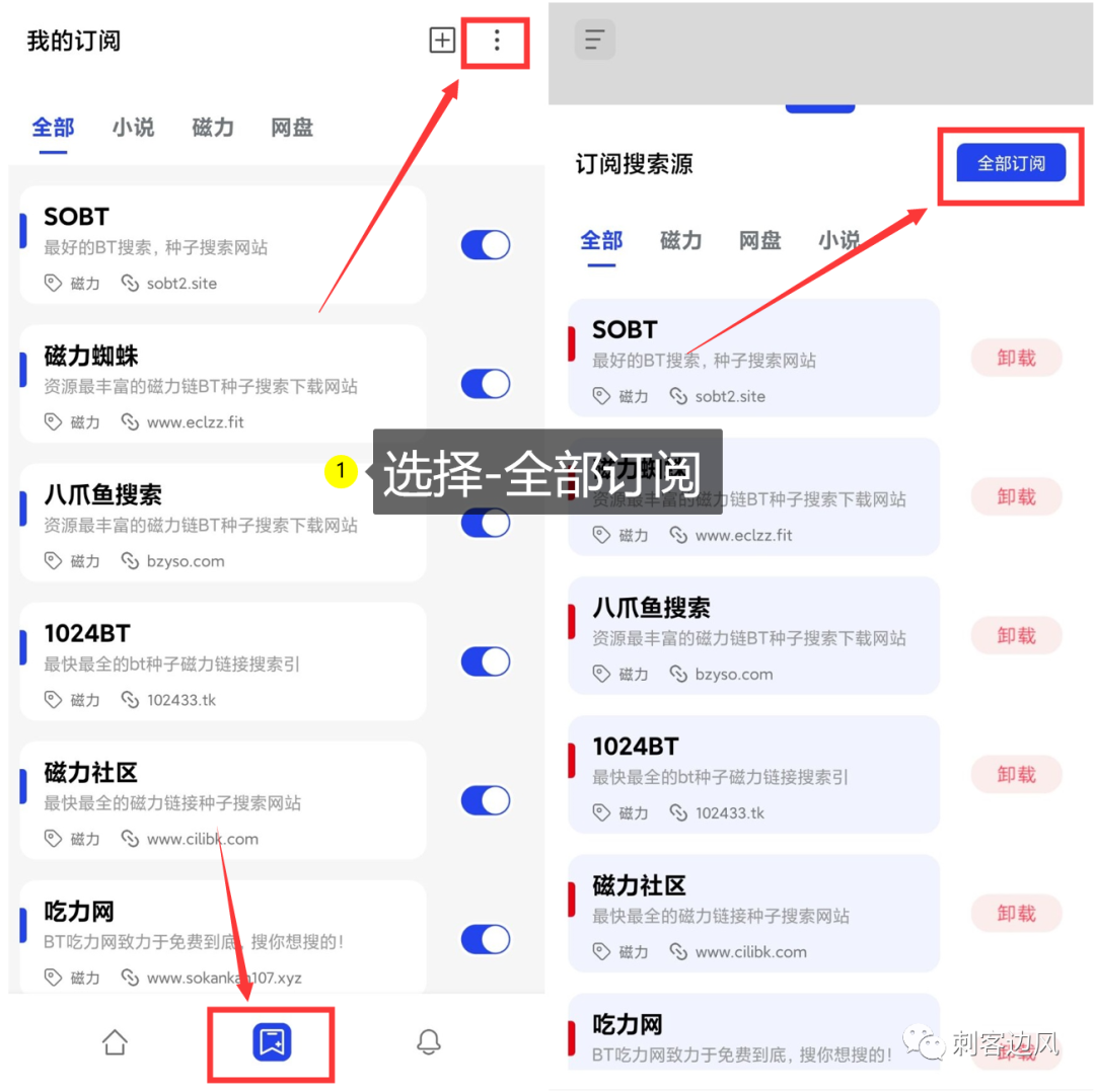 不过在搜索前,我们需要先手动设置一下搜索源,具体先在底部导航栏里,点击第二个图标,进入后,点击“添加订阅”,其次是“全部订阅”,这样操作完就开启了所有搜索源。