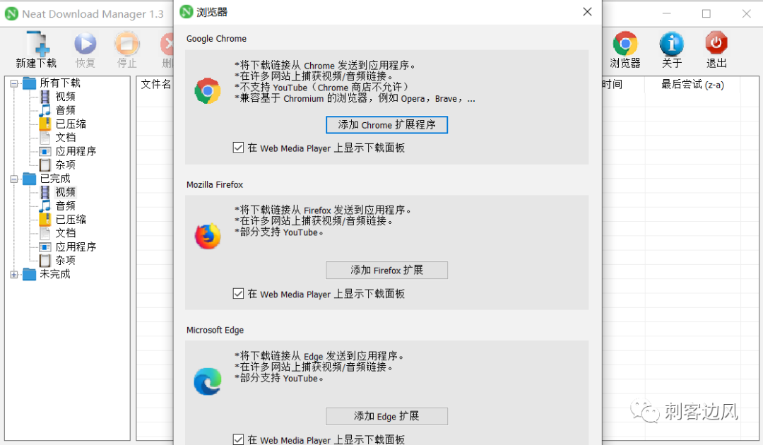 而且,正如前面说的,软件同时支持浏览器插件,我们可以将它与常用的浏览器融合,以后页面上的所有下载,都可以使用它了。