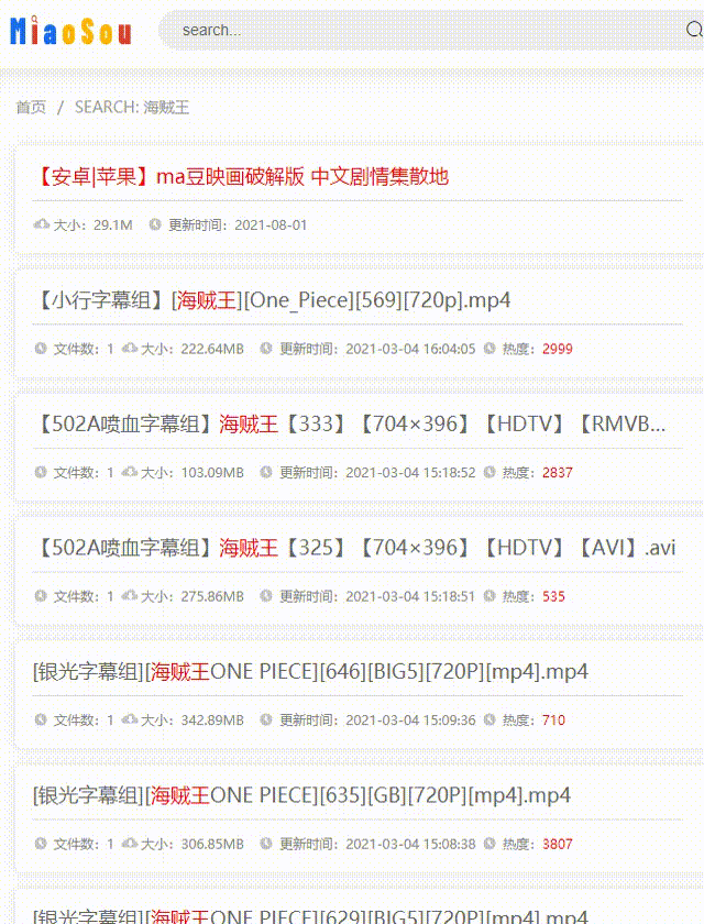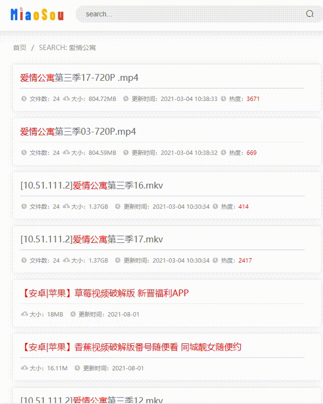 搜索框下方,则提供了一些常用的搜索关键词,很是方便,至于搜索效果也是相当丝滑,搜索结果均注明了文件数、大小、更新时间等,一目了然: