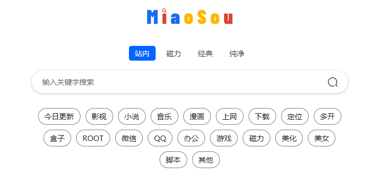 MiaoSou,和刺客之前分享的某款网站很像,逻辑也差不多,打开网站,非常的简洁清爽,并提供了四个搜索引擎:站内、磁力、经典、以及纯净。