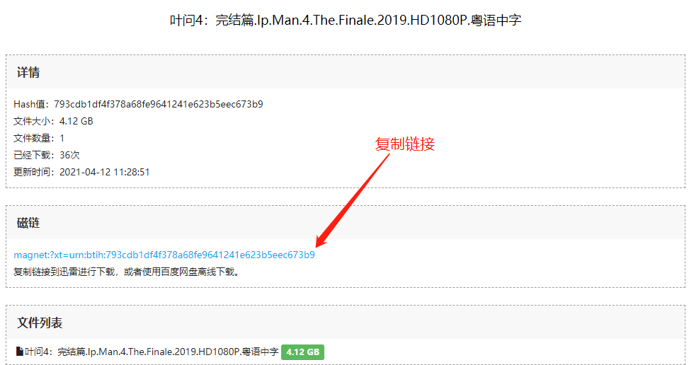 挑选好相应的资源后,点击进入,复制网站提供的链接,再以迅雷或者百度网盘的离线功能进行下载就可以了,极为简单。
