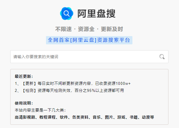 打开网站,就能看到大大的宣传语:“全网首家阿里云盘搜索平台”,这个定语还是蛮中肯的,引擎里包含了所有:影视剧、课程、软件、图片、音乐、游戏、动漫等,并且一直不断更新,目前已经收录的资源达到了1000万+......
