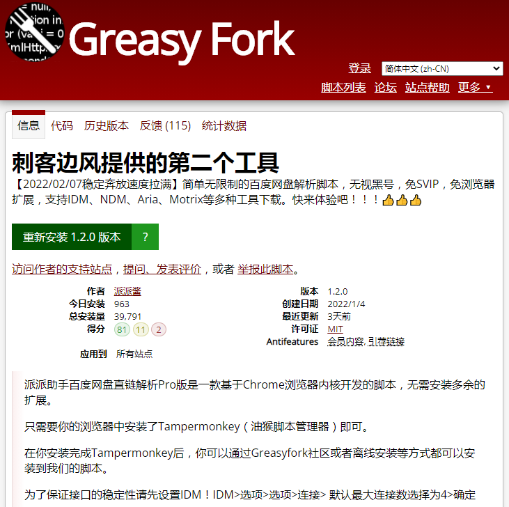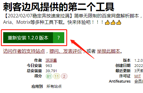 至于安装嘛,在你装好了油猴框架后,直接点击“安装”就可以了(已安装的才会显示重新):