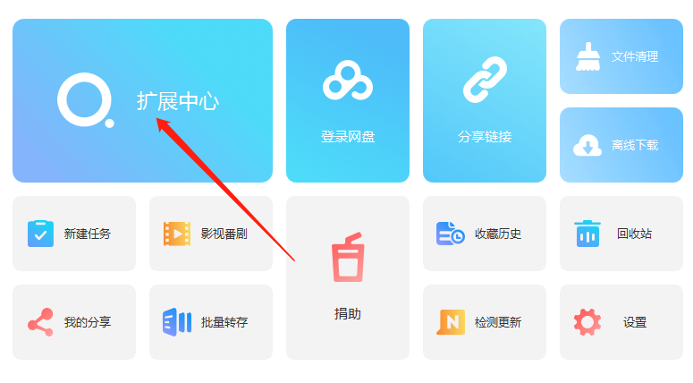 然后,就可以尽情的嗨皮了,尤为强悍的是,这款神器自带了网盘搜索引擎,这就非常有意思了,具体点击这个扩展中心:
