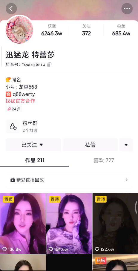第一步,打开抖音APP,找到我们想要下载的博主,比如刺客喜欢的“迅猛龙”: