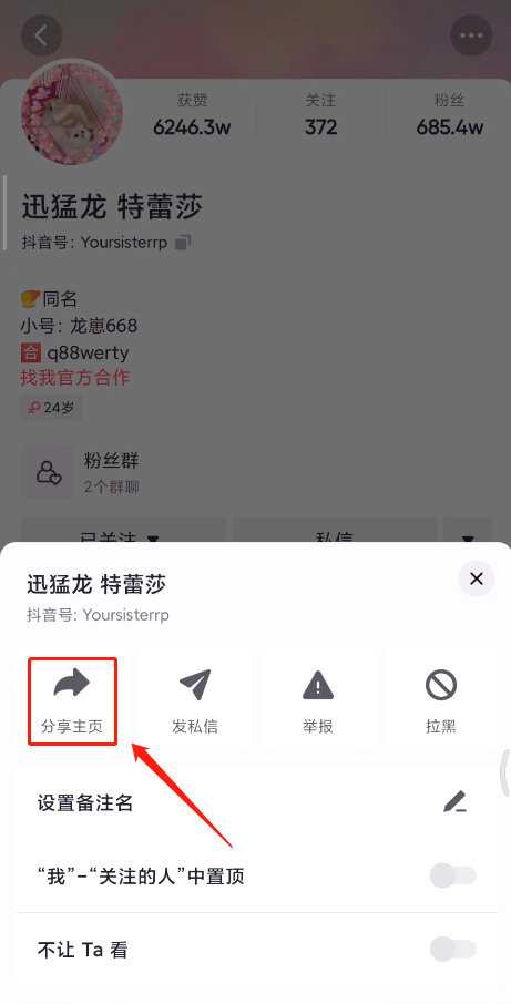 右上角“...”里勾选分享主页: