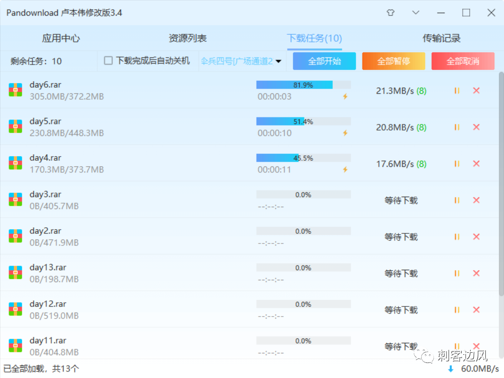 刺客自己在下载资源时,基本都能维持在 10M/s 的下载速度,这里要说明一下,刺客用的是无线WIFI,如果你的宽带足够大,那么下载速度会更快。
