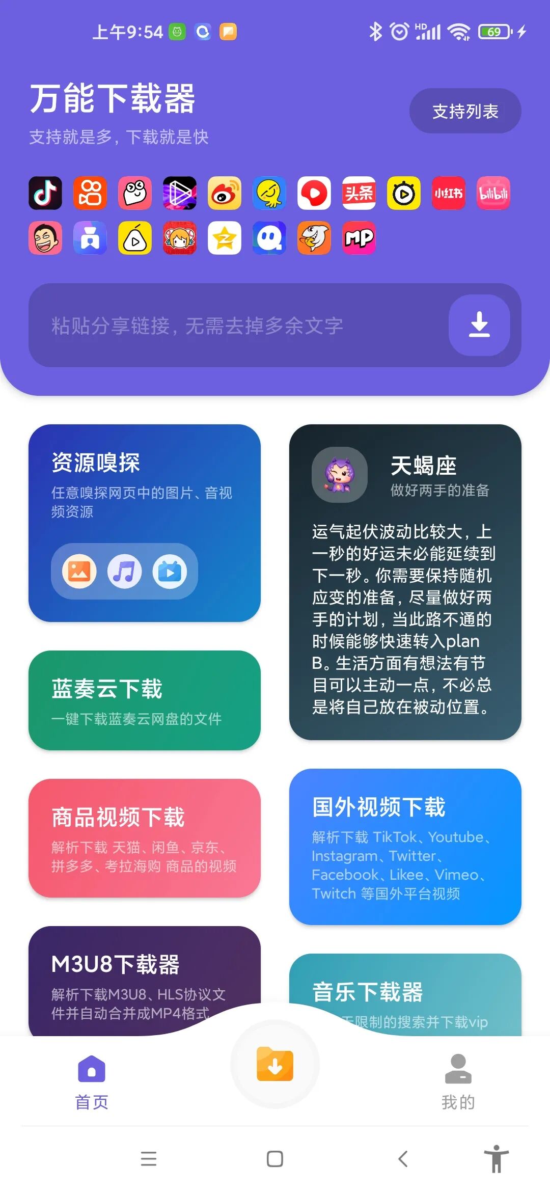 万能下载器,这应该算是一个聚合类的下载神器了,功能也是相当的齐全,正如刺客之前所说的,最强的当属它的资源嗅探,以及与视频下载,包括电商平台的商品头图视频,全都提供一键下载!更附带了音乐下载功能,甚至支持图片、壁纸、头像下载等等。