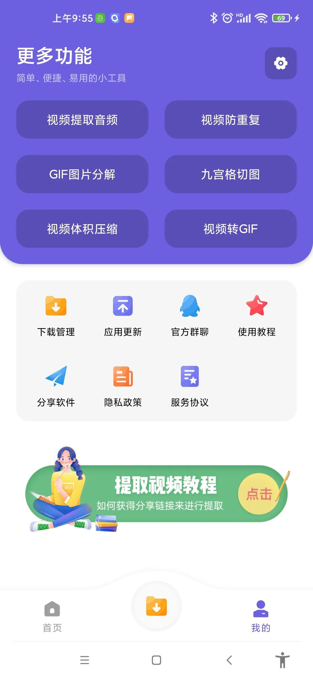 不仅如此,在底部导航“我的”里,更提供了进一步DIY的功能,比如:视频提取音频、防重复、GIF图片分解等等,坦白说,都挺实用的: