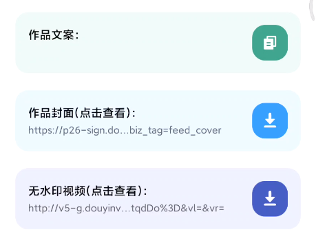 之后便会弹出功能选项,包括文案提取、封面提取、以及最重要的视频下载: