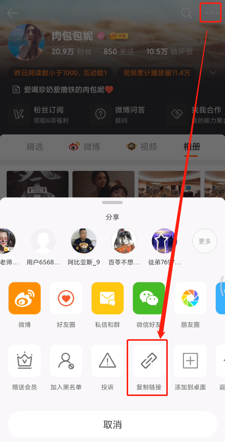 像这种相册,哗啦啦的一堆图,如果是以前,下载的话那可真是累坏了!要一张张的点开下载,现在就不需要这么麻烦了,我们点击右上方的“...”,在弹出的窗口里,选择复制链接。