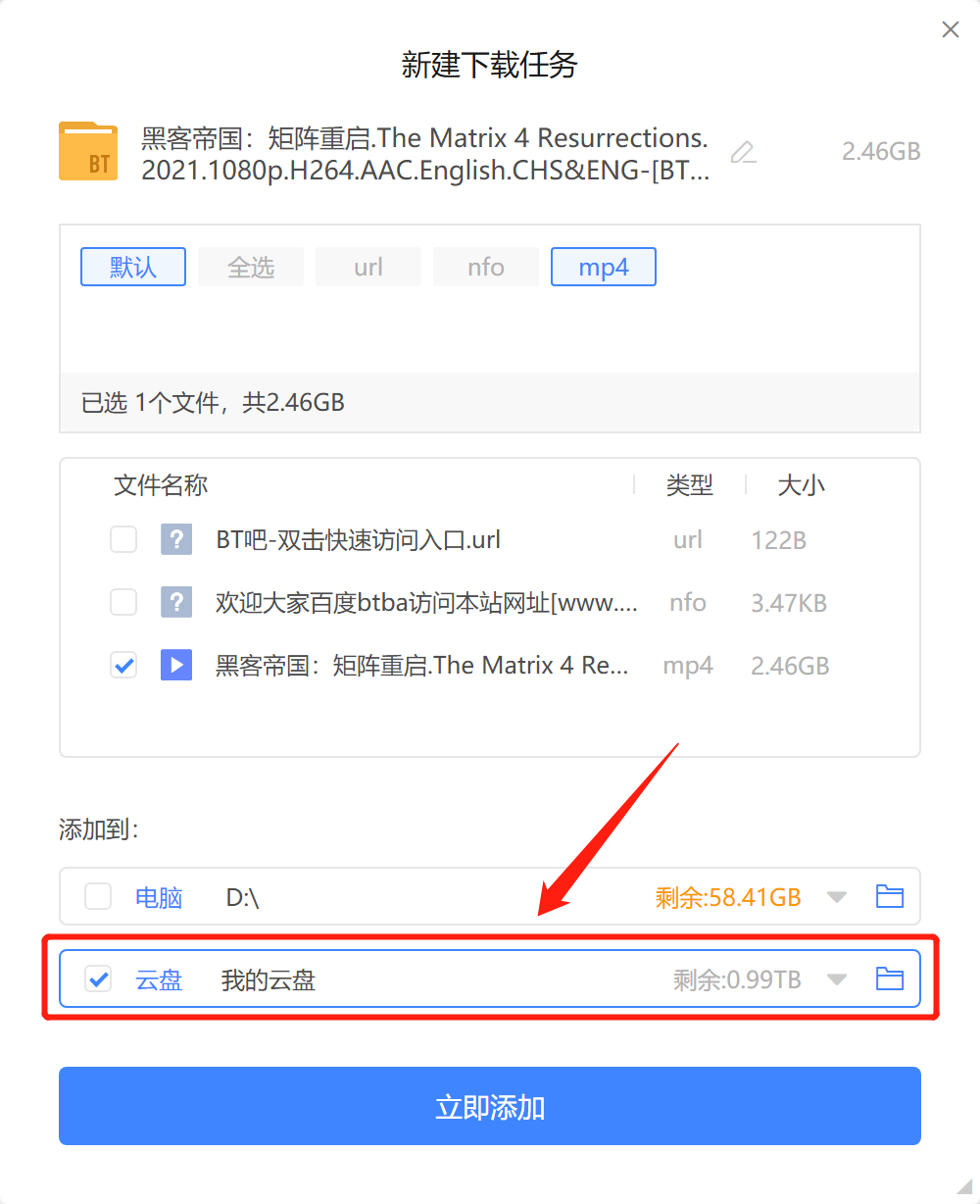 迅雷将会自动识别并新建任务,这个时候,勾选下面我的云盘这里,并且点击下方的立即添加。