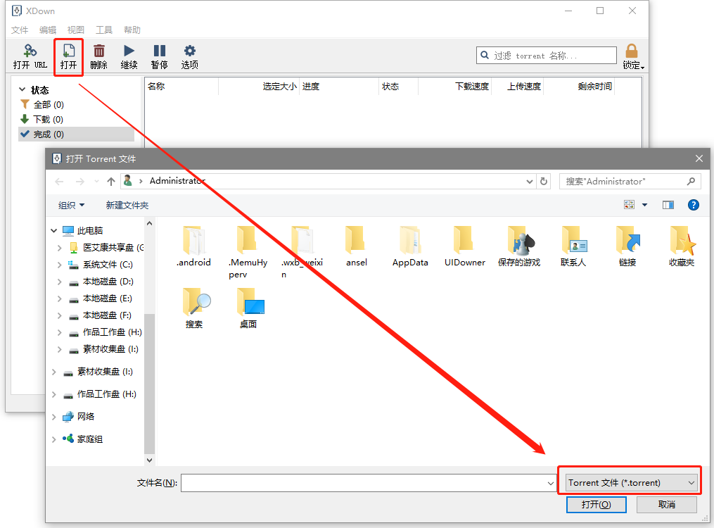 BT种子,也差不多操作,不过使用的就是左上方第二个“打开”,然后选择相应的种子文件就可以了: