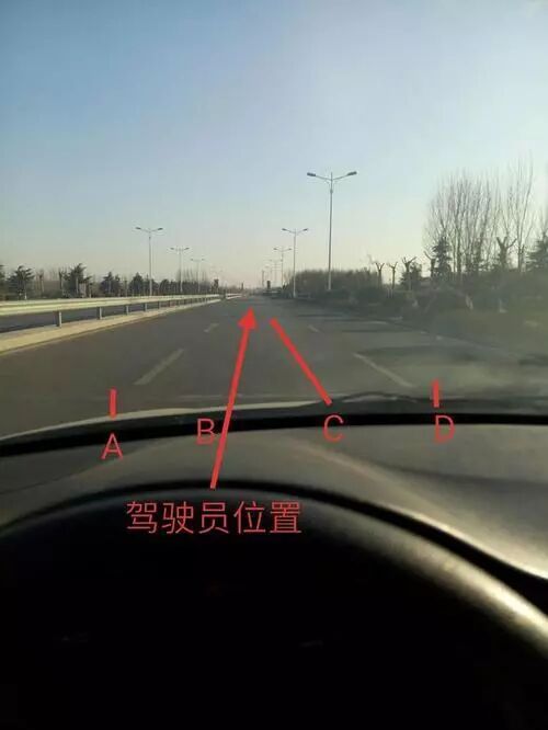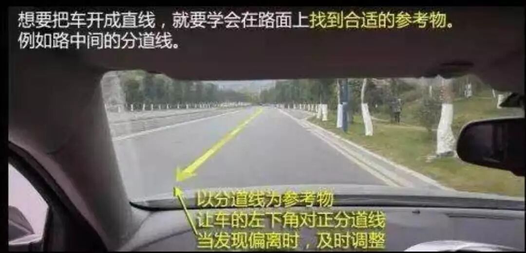直线行驶行车速度较快,不好判断直线,这时可以选择道路两旁的树或者车两侧的边缘线作为参照物,以此来辅助判断。选择参照物时尽量将视线放远,当用余光看到车辆与选择的参照物大致平行时,基本就是保持直线了。